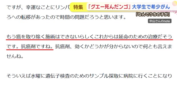 (noteより)「もう癌を取り除く施術はできないらしくこれからは延命のための治療だそうです。抗癌剤ですね」