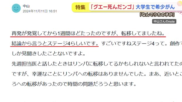 (noteより)「再発が発覚してから1週間ほどたったのですが、転移してましたね。結論から言うとステージ4らしいです」