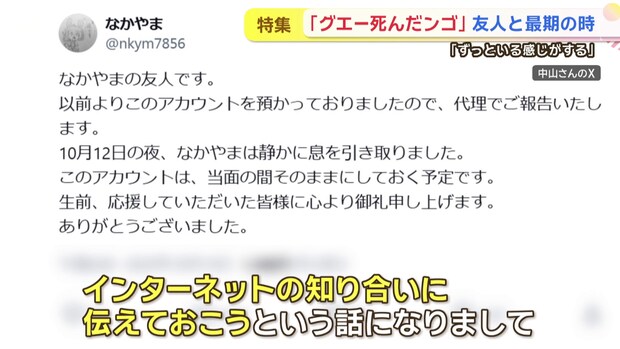 Xの投稿:「なかやまの友人です。以前よりこのアカウントを預かっておりましたので、代理でご報告いたします。10月12日の夜、なかやまは静かに息を引き取りました」