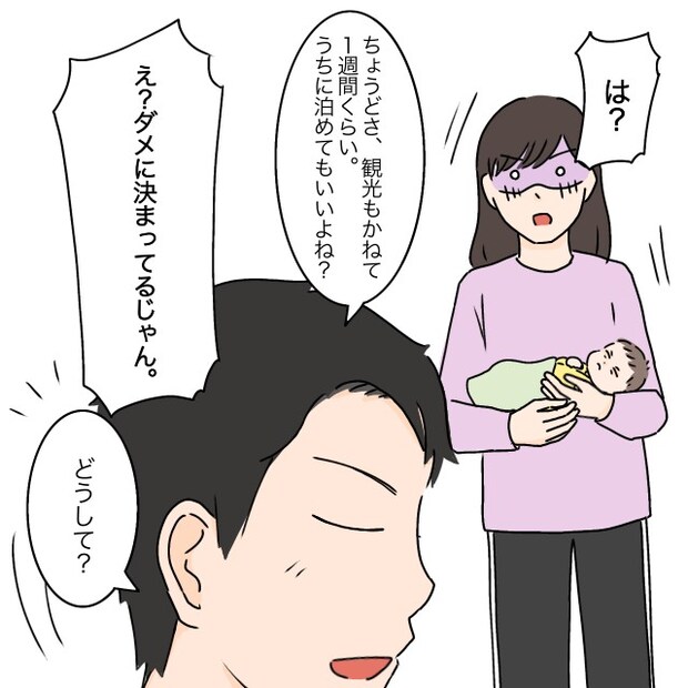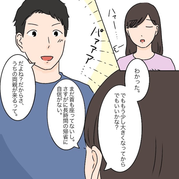 マヒロの顔を両親に見せたい、孫を奪うのはどうなの?などと詰めよるタケルに負けて、「分かった。でももう少し大きくなってからでもいいかな?」と私はため息交じりに言いました。「まだ首も座ってないし。さすがに長時間の帰省に自信がない。」と伝えると、タケルは嬉しそうに笑って「だよね?だからさ、うちの両親が来るって。」とサラリと言いました。