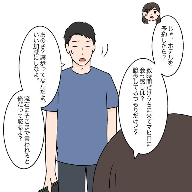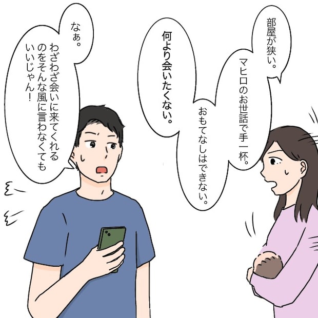 絶対に受け入れたくない私は「じゃ、ホテルを予約したら?数時間だけうちに来てマヒロに会う感じは?譲歩してるつもりだけど?」相談もなく勝手に義両親を呼びよせて、1週間も家に泊めるなんてありえない。でもタケルは「あのさ?譲歩ってなんだよ。いい加減にしなよ。さすがにそこまで言われると俺だって怒るよ?」と、ただ一方的に私が拒否しているような言い方です。