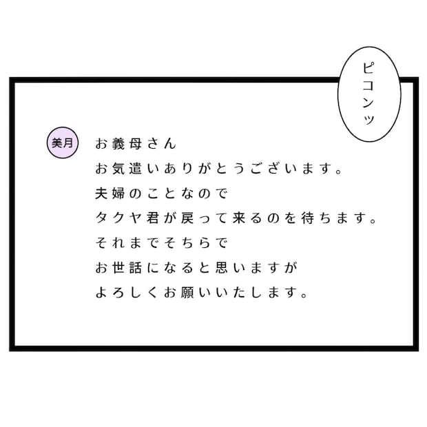 「お義母さん、お気遣いありがとうございます。夫婦のことなので、タクヤ君が戻って来るのを待ちます。それまでそちらでお世話になると思いますがよろしくお願いいたします」