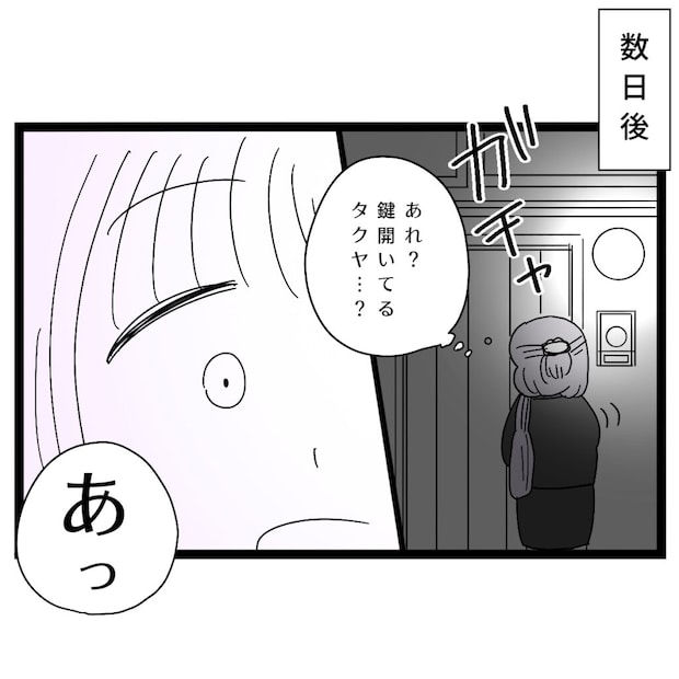 「あれ?鍵開いてる。タクヤ・・?」と家に帰ってドアを開けると、「あっ」