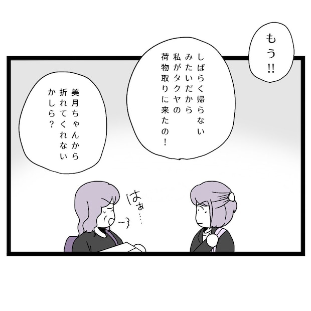 「俺の両親と仲良くしようって思わんの?」そう言って家を出て行た後、帰って来なくなったタクヤさん。そんなタクヤさんの代わりに荷物を取りに来たと、勝手に家に入る義母を見て募るイライラ!美月さん、もう我慢しなくて良いと思います!