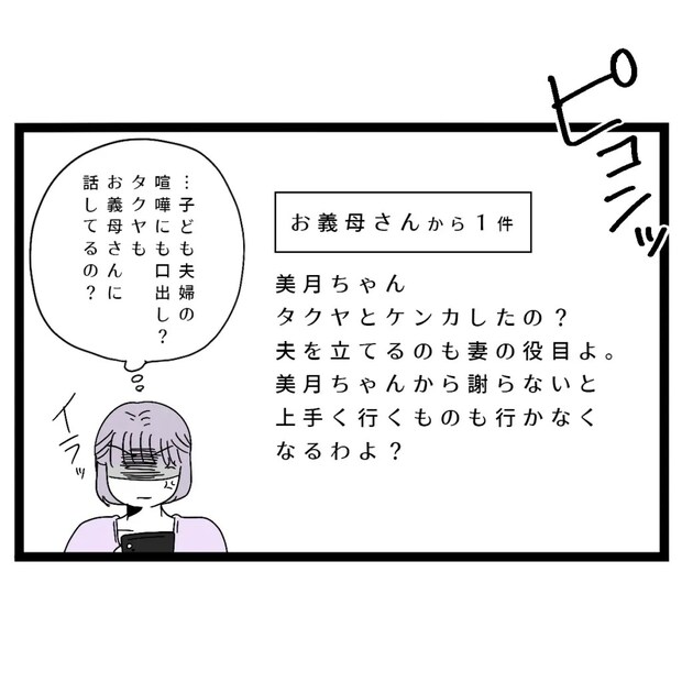 それを読んで、「・・子ども夫婦の喧嘩にも口出し?タクヤもお義母さんに話してるの?」とイライラが募りました。
