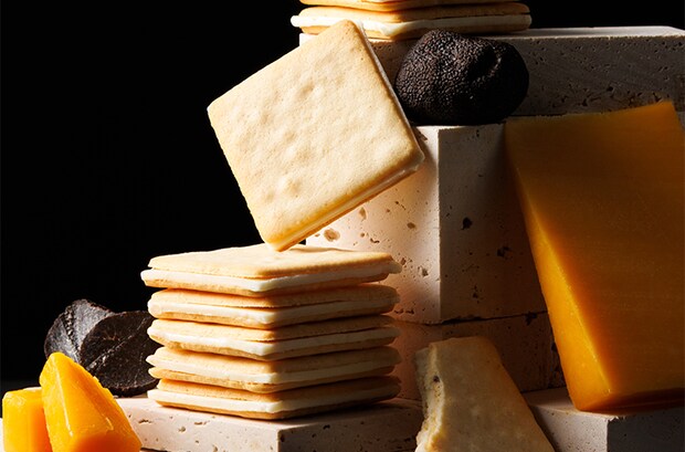 北海道産牛乳とチェダーチーズ、トリュフを混ぜ込んだクッキーに、トリュフ風味のチョコレートプレートをサンドした。