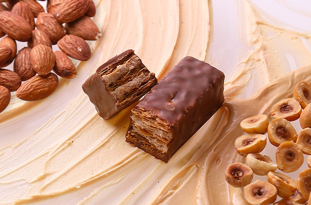 香り高く風味豊かなアーモンドとヘーゼルナッツのクリームをパイでサンドし、ミルクチョコレートで包んだ。ほどよい甘さですっきりした後味。