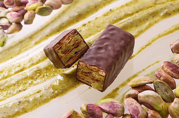 濃厚で奥深い味わいのピスタチオクリームをパイでサンドし、スイートチョコレートで包んだ。ピスタチオの贅沢な香りとコクが広がる。