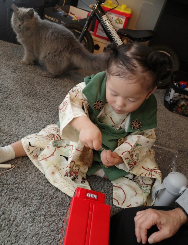 ⑴ なんとびっくり、被布の飾りをつけるのを忘れていた私。子供の着付けは自分達でできたけど、最後の確認不足で帰宅後につけなおしました。