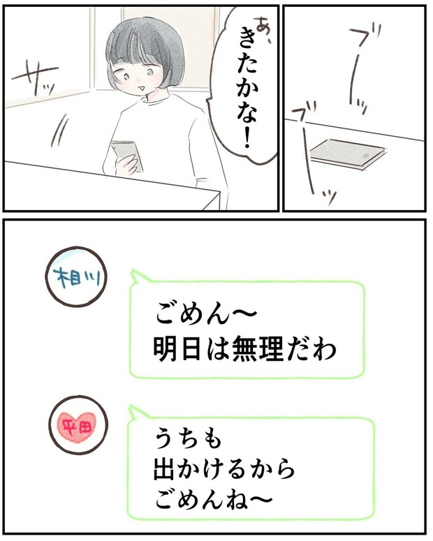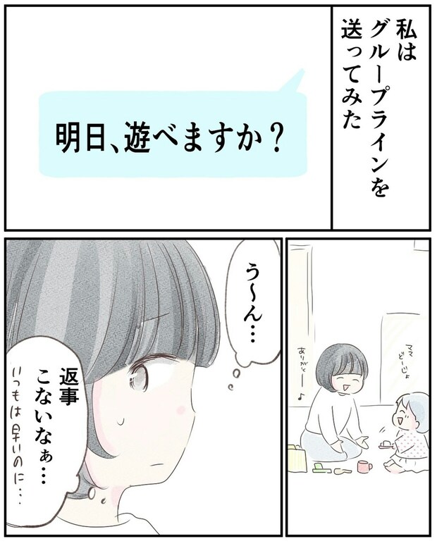 ある日、相川さんのと平田さんの子どもと遊びたいと言い出したいちかちゃん。小野さんはグループラインで連絡を取ってみます。