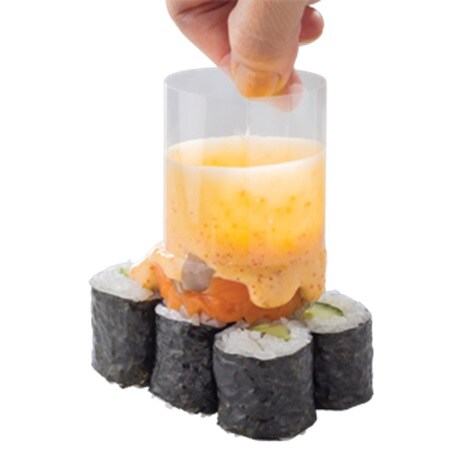 カンボジアの「ラヴァロール」300円(税込)は、角切りサーモンをトッピングしたかっぱ巻きの上から、オリジナルの甘酸っぱい人参ソースが溶岩(Lava)のようにとろりと流れ落ちる、目を引くメニュー。