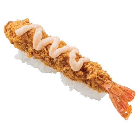 シンガポールの「ジャンボエビフライ明太マヨ」450円(税込)は、海老本来の旨味と食感がしっかりと感じられるジャンボサイズのブラックタイガーを海老フライにし、明太マヨをトッピングした、食べ応え抜群の一品だ。
