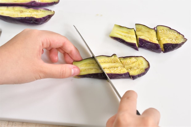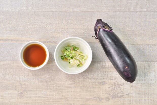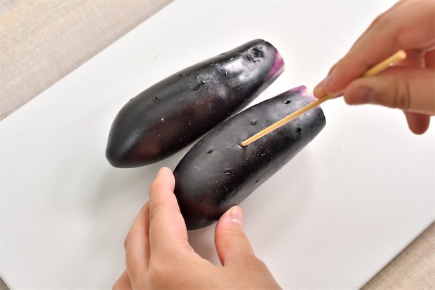 1. なすをよく洗い、ヘタを切り落とし、竹串や爪楊枝で数か所穴を開ける。