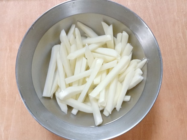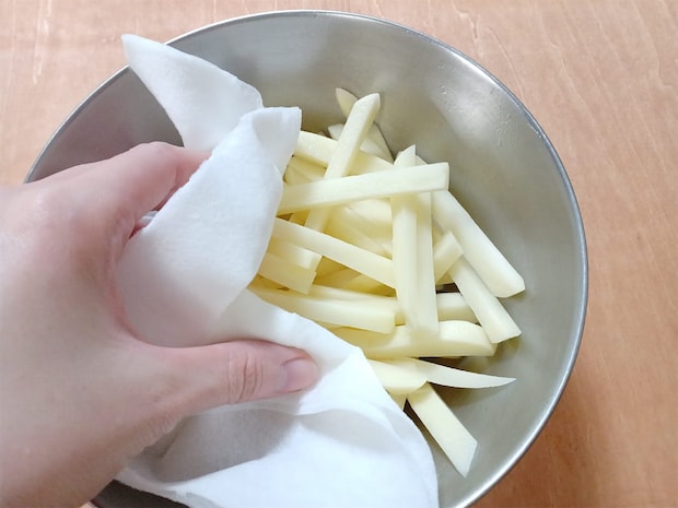 3. じゃがいもはキッチンペーパーなどで水分を拭き取って、180℃のこめ油で火が通るまで油で揚げる。