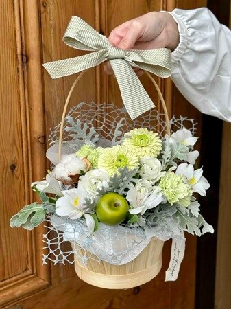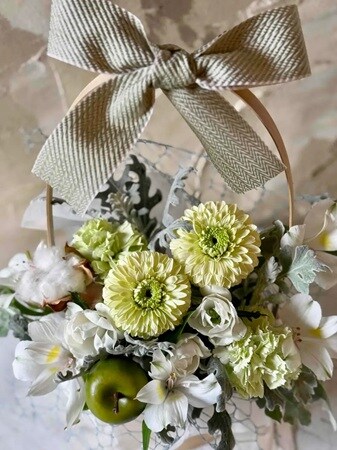 ナチュラルカラーのリボンをあしらった手付きバンブーバスケットに、ころんとした可愛らしいフォルム。手に取るだけで心までほっと和むような、優しいアレンジとなっている。