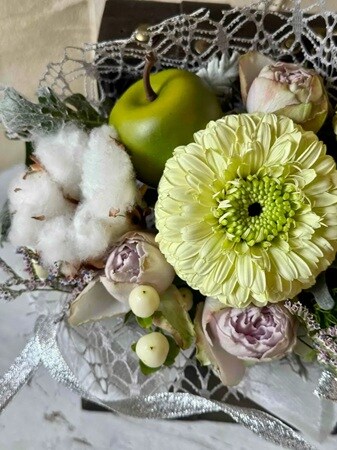 冬限定の「生花のトレジャーボックスアレンジ」は、りんごやコットン、きらめくネットやリボンをあしらった、クリスマスムードたっぷりのアレンジメント。