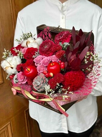 アンティーク調のトレジャーボックスに花々を詰め込んだ、あたたかみと華やかさを感じる、冬にぴったりの限定デザインとなっている。