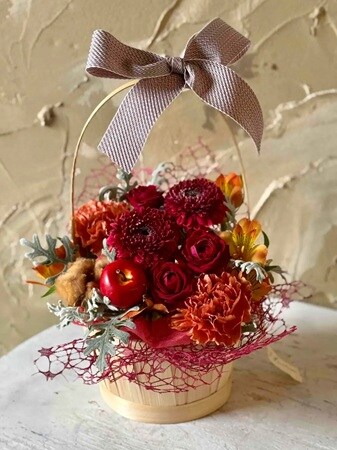 さらに、冬限定の「生花のリボンバスケットアレンジ」は、人気の八重咲ガーベラやバラをメインに、可愛らしいりんごやコットンを添えて冬らしくまとめた。