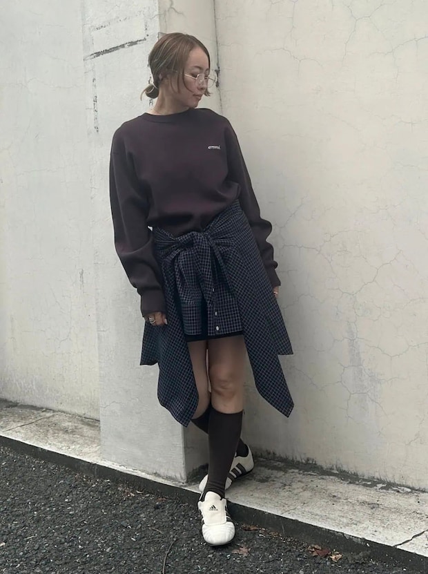 ブラウントーンでまとめたカジュアルコーデは、ともすると重く見えがち。ミニボトムの肌見せに加え、華奢なメタルフレームでヌケ感を演出するだけでグッとあかぬけたシティスタイルに。