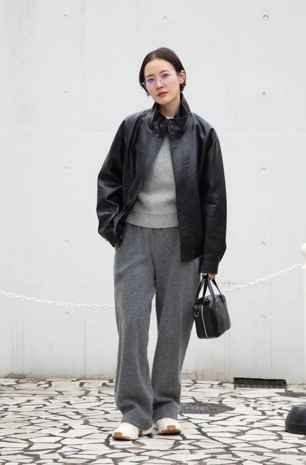 今季らしいレザーブルゾン。一見ハードな印象になりがちだけど、華奢なフレームの眼鏡をかけるだけでどこか柔らかな雰囲気に。ブルゾンやバッグの金具に合わせてフレームはシルバーをセレクト。