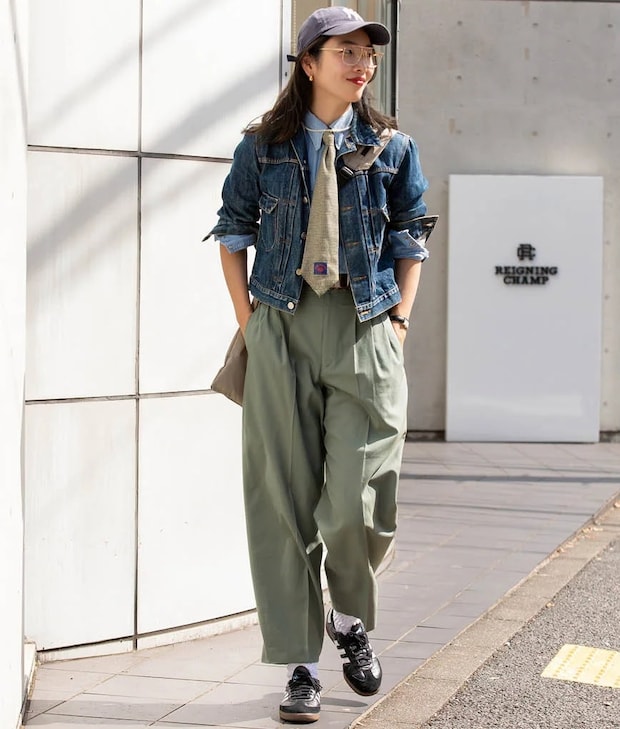 デニムジャケットにキャップ、スニーカーと、カジュアルなプレッピースタイルは小物使いも大きなポイントに。パールのネックレスや腕時計、メタルフレームの眼鏡が大人の上質感を演出。