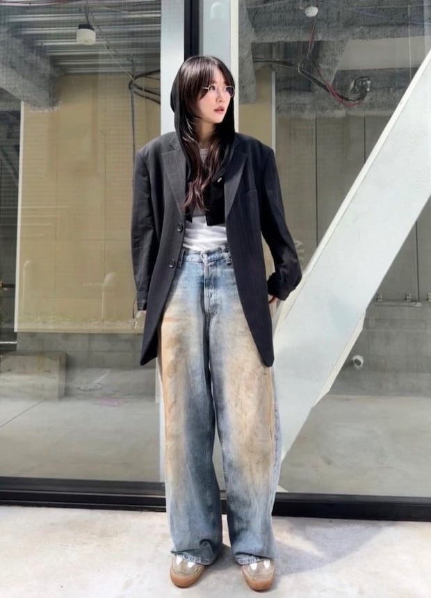 ボリュームたっぷりのワイドデニムはきちんと感のあるブラックジャケットを合わせて大人っぽく。ピアスと共に繊細なゴールドカラーの眼鏡が上品なムードを加速。