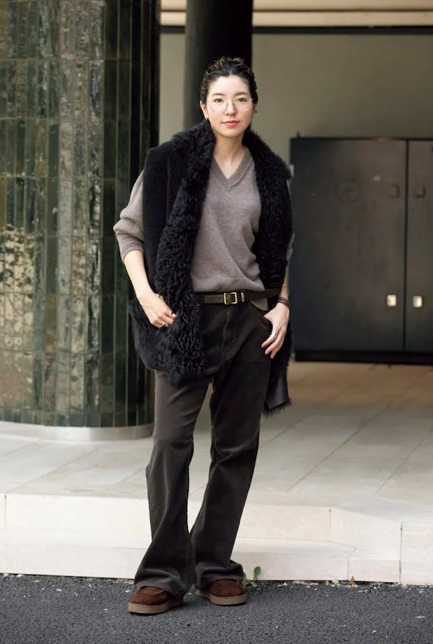 ブラウントーンでまとめたカジュアルスタイルは、旬のファーベストを羽織って華やかに。ニットやファー、コーデュロイなどウォーミーな素材感にメリハリをもたらすのはやっぱりメタルフレームの眼鏡♪