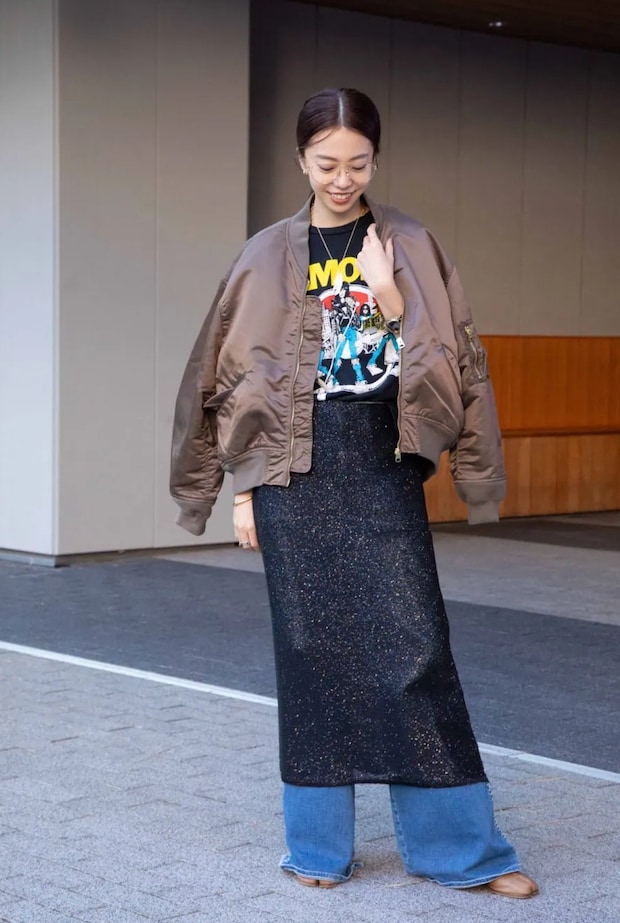 ロックプリントのTシャツにラメ入りスカートのレイヤードが目を引くカジュアルスタイル。そのままでも十分素敵だけれど、ゴールドの華奢なネックレスと眼鏡で女性らしさをプラスすれば洒落感も一層UP。