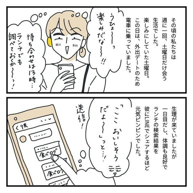 彼とのデートを楽しみにしていた、キクチ│片耳なんちょー(@kkc_ayn)さん。生理1日目でしたが体調もよく、意気揚々と電車に乗り込みます。