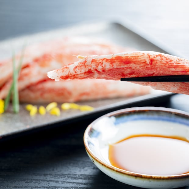 高級すり身を使用し、カニのゆで汁を濃縮したカニエキスなどを混ぜ合わせる独自製法を採用。口に広がる旨みは、まさに蟹に迫るジューシーさです。 - カニ脚そっくりの繊維感