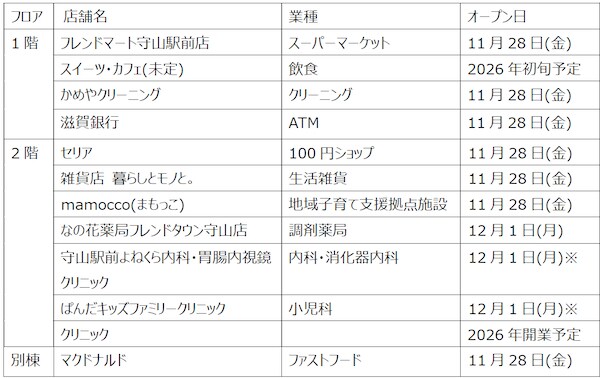 テナントは、1階にフレンドマート守山駅前店/スイーツ・カフェ(未定)/かめやクリーニング/滋賀銀行。2階にセリア/雑貨店 暮らしとモノと。/mamocco(まもっこ)/なの花薬局フレンドタウン守山店/守山駅前よねくら内科・胃腸内視鏡クリニック/ぱんだキッズファミリークリニック/クリニック。別棟にマクドナルドが入る。1階スイーツ・カフェは2026年初旬オープン予定、2階クリニックは2026年開業予定、2階なの花薬局フレンドタウン守山店は12月1日(月)オープンとなっている。