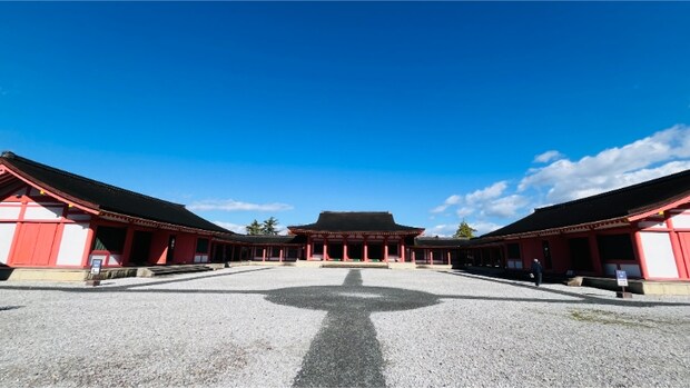 正殿前の広場から見渡すと、左右対称の建物配置がとても美しく、思わず深呼吸。柱や瓦、軒の影まで含めて画になる空間でした。空の色も、建物の重厚さを引き立てていました。