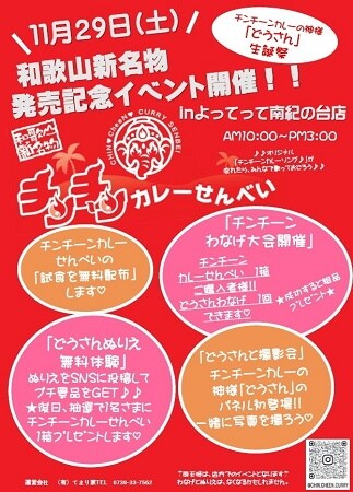 発売日の11月29日(土)には、「よってって南紀の台店」にて「チンチーンカレーせんべい」発売記念イベントを開催。店頭には“どうさんパネル”が設置され、フォトスポットとして楽しむことができる。その他多数の企画が用意されているので、チラシをチェックしよう。