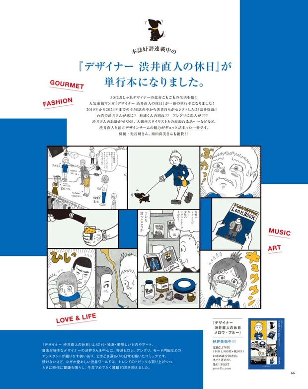 連載陣も好調。あ、そうそう、長年オトナミューズで連載している渋谷直角先生の漫画『デザイナー渋井直人の休日』の最新刊が発売になりました。50代のおしゃれなデザイナー、渋井さんに巻き起こる悲喜こもごもの出来事を毎月8ページでお届けしているひそかな人気連載。2019年から2024年分から23話を厳選して一冊になったそうです。