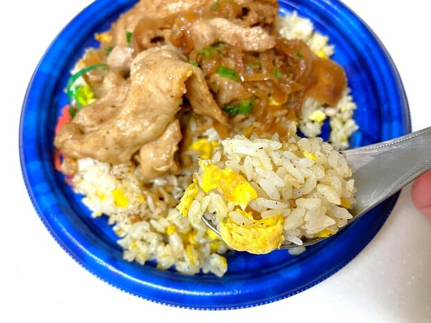 お腹ペコペコだった筆者は、炒飯の上に豚肉がたっぷりのっているビジュアルにまず惹かれて手に取りました。