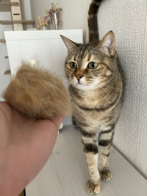 投稿者・さくらとかえでさんは、愛猫の換毛期になるとブラッシングをします。ごっそり抜けた毛を本人ならぬ本猫に見せてみると…?