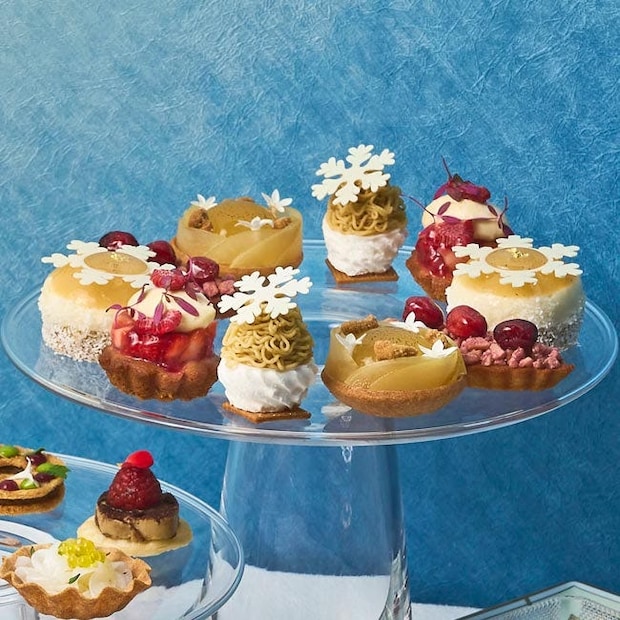透明な輪っか状のスタンドが印象的な、「にじり」の冬のアフタヌーンティー。華やかな白と赤を基調としたスイーツには、雪の結晶がトッピングされた「洋梨とチョコレートのケーキ」、りんごとチーズクリームのハーモニーが楽しめる「アップルタタン」、さくさくのメレンゲと濃厚なマロンの風味が絶妙な「栗と洋梨のモンブラン」など計5種類を用意。