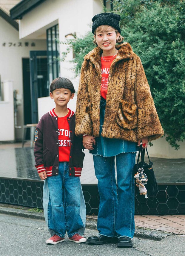 真っ赤なトップスとこなれ感のあるデニムパンツを合わせた親子リンクコーデ。ママは、パンツにデニムスカートをレイヤードしたり、レオパードコートを羽織って華やぎカジュアル。といろくんは、旬のカーブシルエットのデニムにスタジャンでアメカジムードをひとさじ。赤を軸にそれぞれが自分らしく楽しむスタイリングが素敵♡