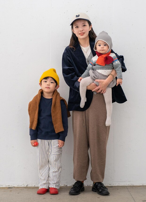 肌触り抜群のもこもこ素材を取り入れてやさしいムードに仕上げたサワイファミリー。トレンドのブラウンやシックなネイビー、グレーでまとめることで、ほっこりしながらも洗練された印象に。ママはキャップ、キリくんはニット帽、キナリちゃんはボンネットと、ヘッドピースを揃えることで統一感もアップ。