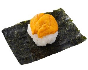 濃厚な味わいのうにを使った一品。海苔で包んで味わう。価格は1貫210円(税込)。