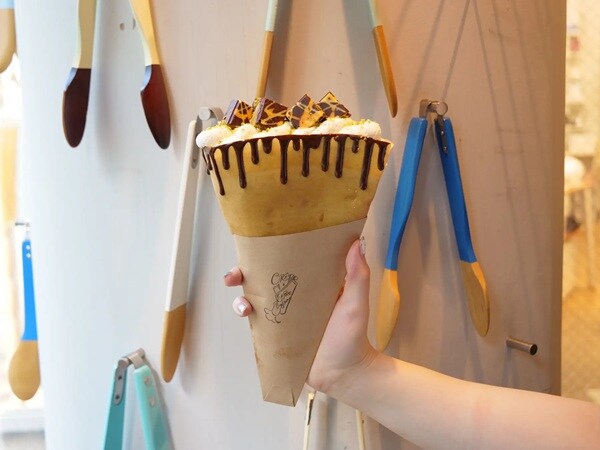 1Fにある「クレープとエスプレッソと自由形」は、SNSで話題のクレープ専門店。パリパリ食感のクレープ生地に、独創的なフレーバーを組み合わせた“唯一無二の新感覚クレープ”を提供している。