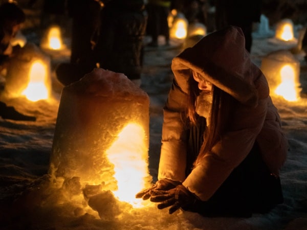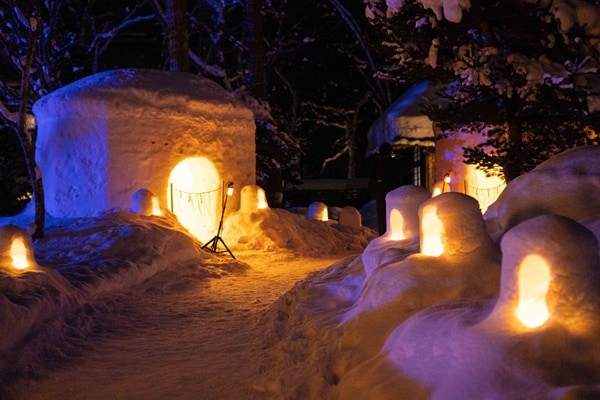 夜になると真っ白な雪の大地にぽつりぽつりとあたたかな光が浮かび上がり、訪れる人を優しく包み込むような非日常の絶景が広がる。