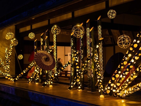 平安時代の平家の繁栄をイメージした“竹灯篭”や“竹毬”が織りなすきらびやかな灯りが、幻想的に会場を照らす。