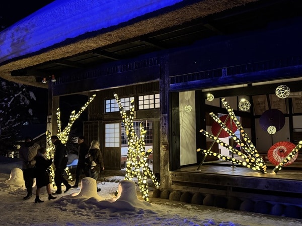 雪に包まれた茅葺屋根の古民家集落に大小さまざま“かまくら”が灯り、どこか懐かしいあたたかな雰囲気が堪能できる。