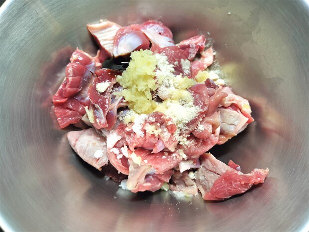 5. ボウルに砂肝を入れ、鶏ガラスープの素、オイスターソース、塩、にんにく、酒を入れて30秒揉みこみます。
