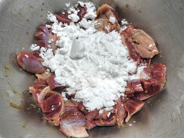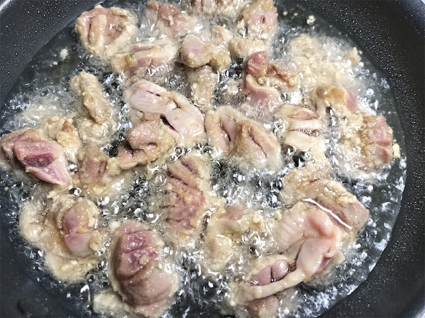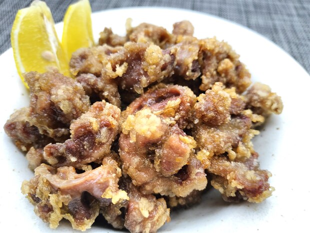 焼き鳥屋では火を通しやすくするため、小さく切って提供されることが多い砂肝ですが、丸ごとだと厚みがあり、そのままでは中まで火が入りにくい食材です。中華料理では薄切りにして炒めることもありますが、唐揚げの場合はある程度の大きさを残したいもの。