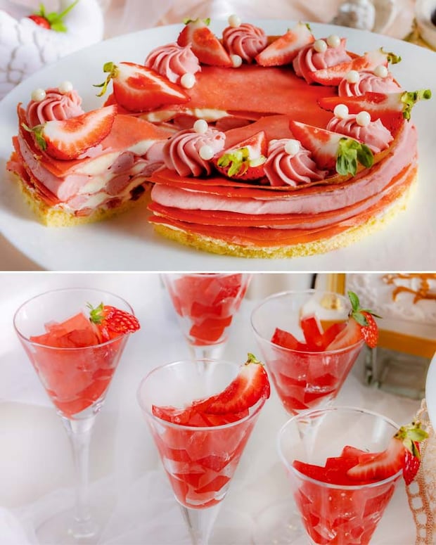 「スイートフェザー」は、いちご風味のクレープ生地にディプロマットクリームを塗り、いちごのガナッシュクリームと交互に重ねたクレープのケーキ。クレープとクリームの美しい層にも注目して。