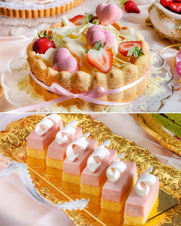 癒しを司る天使ラファエルから着想を得た「ラファエルの秘宝」は、いちごのムースの上にホワイトチョコレートフレークとフレッシュいちご、ハートの形をしたマカロンを飾ったシャルロットケーキ。