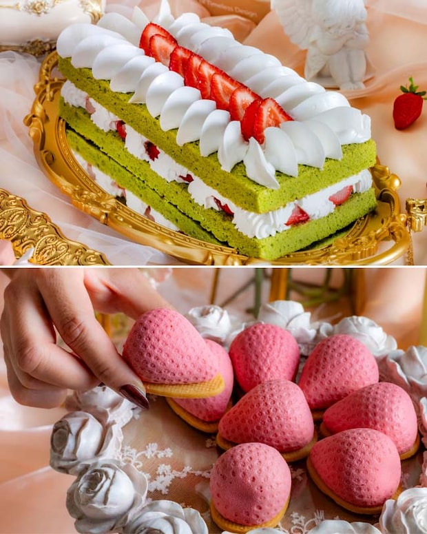 いちごのフォルムが目を引くのは、天使が天界で愛でるいちごをイメージした「天界を彩るいちごたち」。シトラス香るレモンクリームといちごの甘みが調和し、口の中に爽やかな風味を届けるムース。
