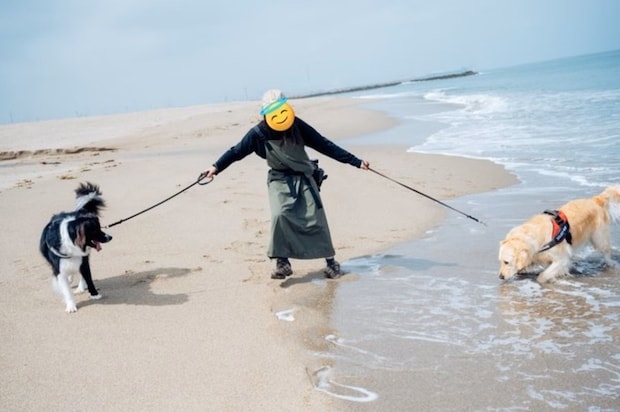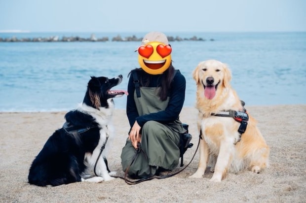 理想の写真では、青い海をバックにたびくんとぼんくんが飼い主さんの横に寄り添い、まるで家族写真のよう。たびくんは忠実なまなざしで飼い主さんを見つめ、ぼんくんは満面の笑みでカメラ目線。絵に描いたような理想の多頭飼いですね。